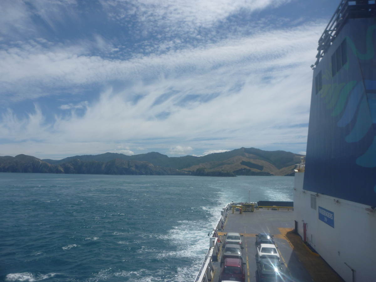 Am nächsten Morgen beim Frühstück traffen wir dann noch die zwei Holländer aus Wanaka,Franz Josef und Harihari wieder. Sie waren auch dabei Richtung Fähre aufzubrechen. Auf der Fähre haben wir uns dann aber nicht mehr gesehen. Die Überfahrt nach Wellington verlief reibungslos. Die Cook-Strait war fast spiegelglatt, ganz entgegen ihrem Ruf. Schwein gehabt, wir mussten nicht einmal die Fahrräder anbinden, so glatt war das Meer.