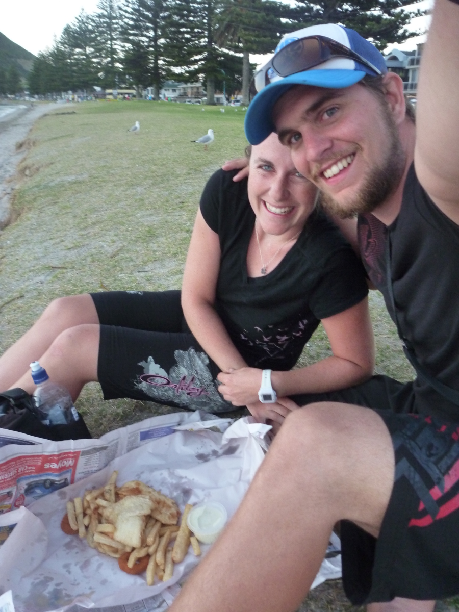 zur Feier des Tages gingen wir noch zusammen im Pool baden und Fish’n'Chips Essen